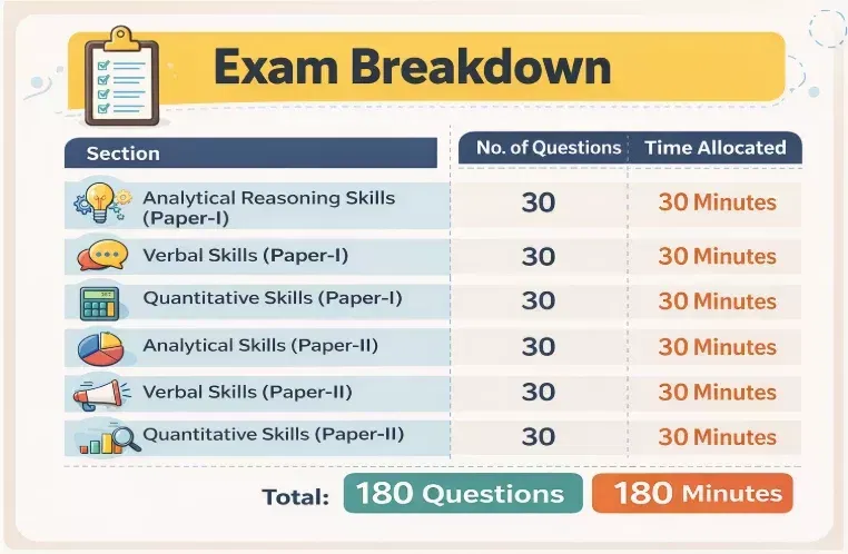 Students must follow the ATMA Exam Pattern 2026 to prepare for the exam. There are 6 sections in the exam with 30 questions each. The total questions are 180 with 180 marks. The ATMA exam duration is 180 minutes.