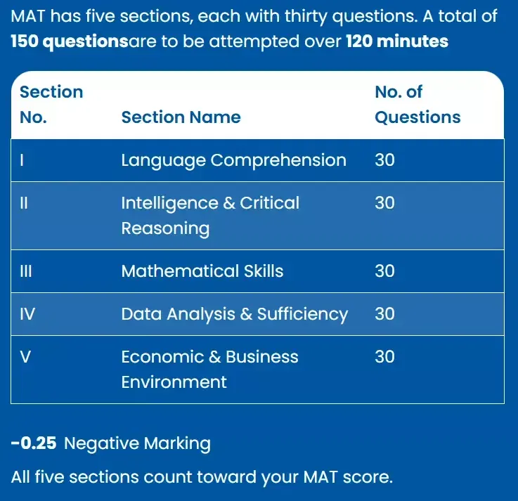 Prepare for the exam with the updated MAT syllabus covering five key sections: Language Comprehension, Intelligence & Critical Reasoning, Mathematical Skills, Data Analysis & Sufficiency and Economic & Business Environment.