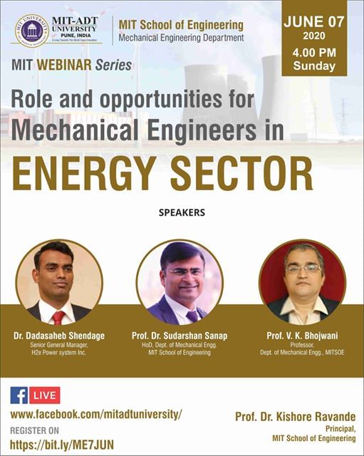 The Mechanical department of MIT School of Engineering [MITSOE] is going to conduct its webinar series on the "Role and Opportunities for Mechanical Engineers in the Energy Sector" on 7th June 2020 for the aspiring mechanical engineers.