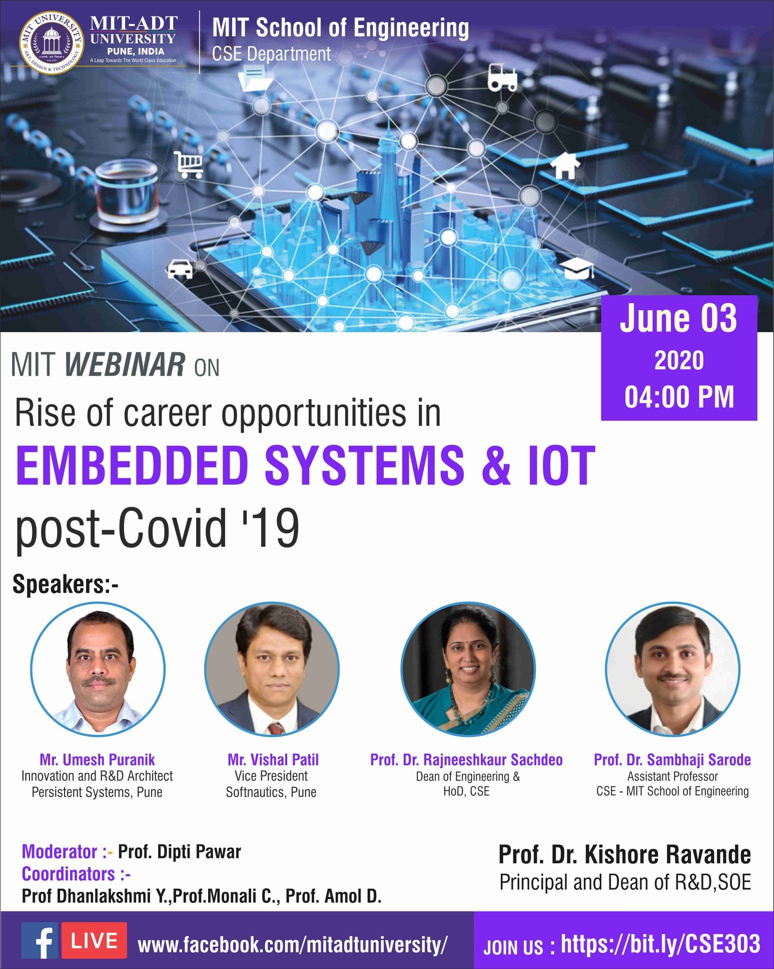 Join the WEBINAR on 3rd June in the topic “Rise of career opportunities in EMBEDDED SYSTEMS & IOT post-COVID19" brought to you by the MIT School of Engineering’s CSE Department.