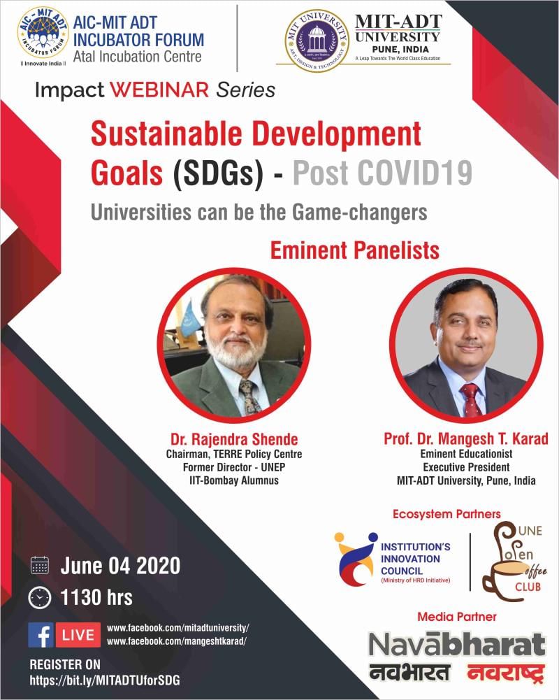Listen to the experts Dr. Rajendra Shende, Chairman of TERRE Policy Centre, Former Director-UNEP, IIT Bombay Alumni, and Prof. Dr. Mangesh Karad, Eminent Educationist & Executive President-MIT ADT University, Pune for the expert webinar on Sustainable Development Goals (SDGs) -Post COVID19 on 4th June at 11.30 Am. You can register in the following link.