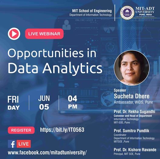 To be a part of the WEBINAR on the topic "Opportunities in Data Analytics" by the MIT School of Engineering, Department of Information Technology, You can register in the following link.