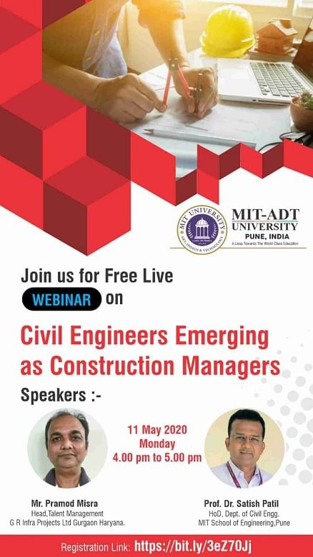 The webinar will be conducted by Mr. Pramod Misra, Head, Talent Management, GR Infra Projects Ltd Gurgaon Haryana. Prof. Dr. Satish Patil, HoD, Dept. of Civil Engineering, MIT School of Engineering, Pune.