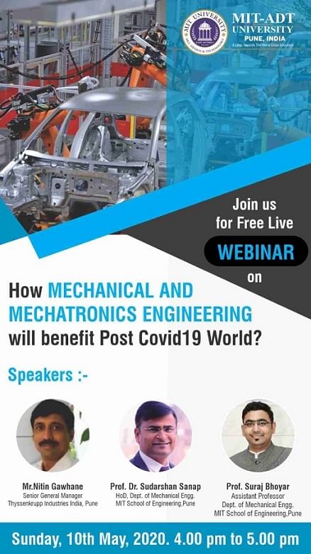 The webinar was conducted by Mr. Nitin Gawhane, Senior General Manager, ThyssenKrupp Industries India, Pune, Prof. Dr. Sudarshan Sanap, HoD, Dept. of Mechanical Engineering, MIT School of Engineering, Pune, and Prof. Suraj Bhoyar, Assistant Professor, Dept. of Mechanical Engineering, MIT School of Engineering, Pune.