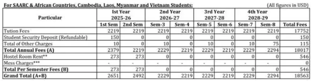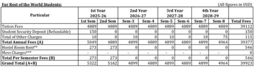 - Fees include tuition, other charges, and hostel room rent (where applicable).